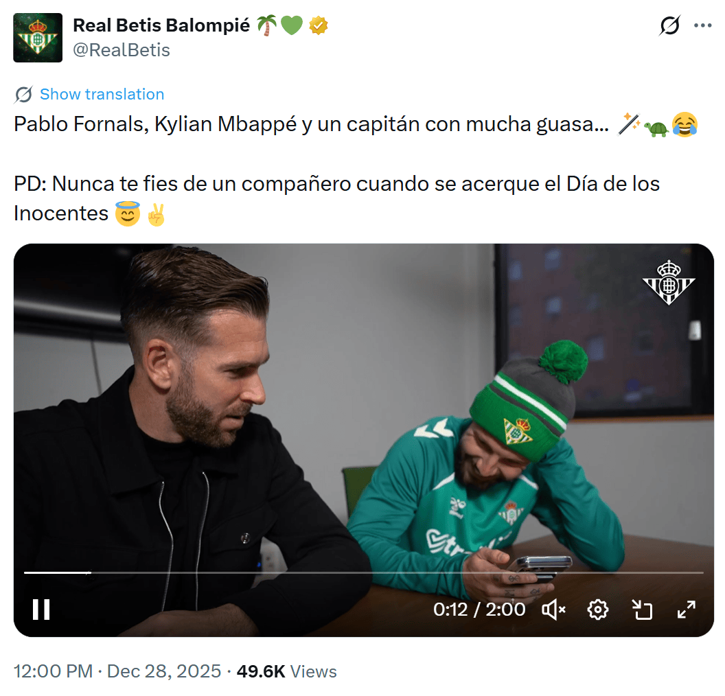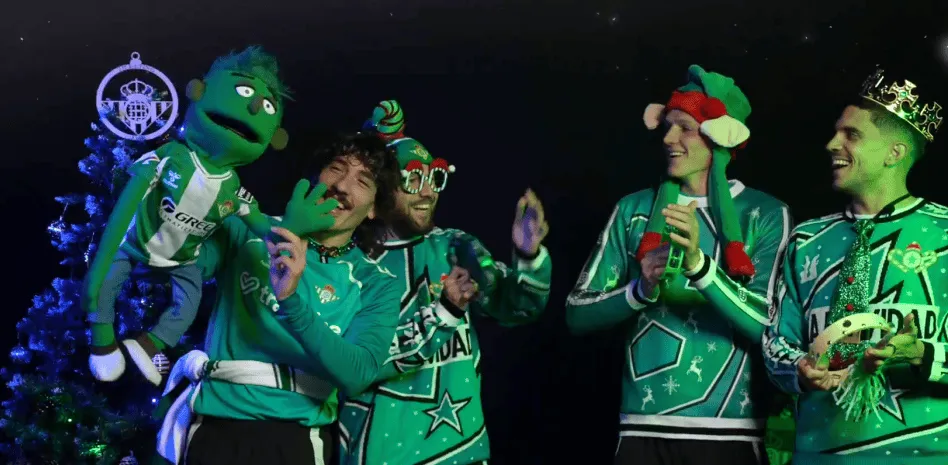 這支以創(chuàng)意著稱、社媒風格一向活潑的球隊,當天還拍攝了一段節(jié)日視頻:貝萊林、魯伊巴爾、阿爾蒂米拉與巴爾特拉身著綠白相間的圣誕服飾合唱頌歌,烘托節(jié)日氣氛。