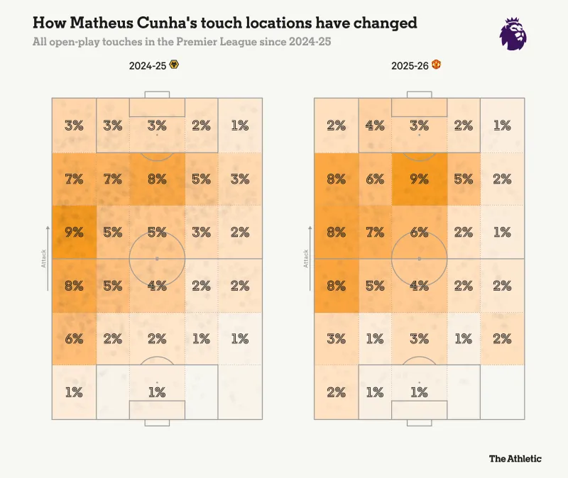 先來(lái)看利好一面:庫(kù)尼亞早已無(wú)縫適配老特拉福德的節(jié)奏。雖不再是狼隊(duì)時(shí)期手握大量球權(quán)的核心,他仍能在前場(chǎng)三區(qū)的關(guān)鍵區(qū)域覓得控球機(jī)會(huì);與B費(fèi)同場(chǎng)競(jìng)技、分享球權(quán),絲毫沒(méi)有削弱他的進(jìn)攻銳氣。