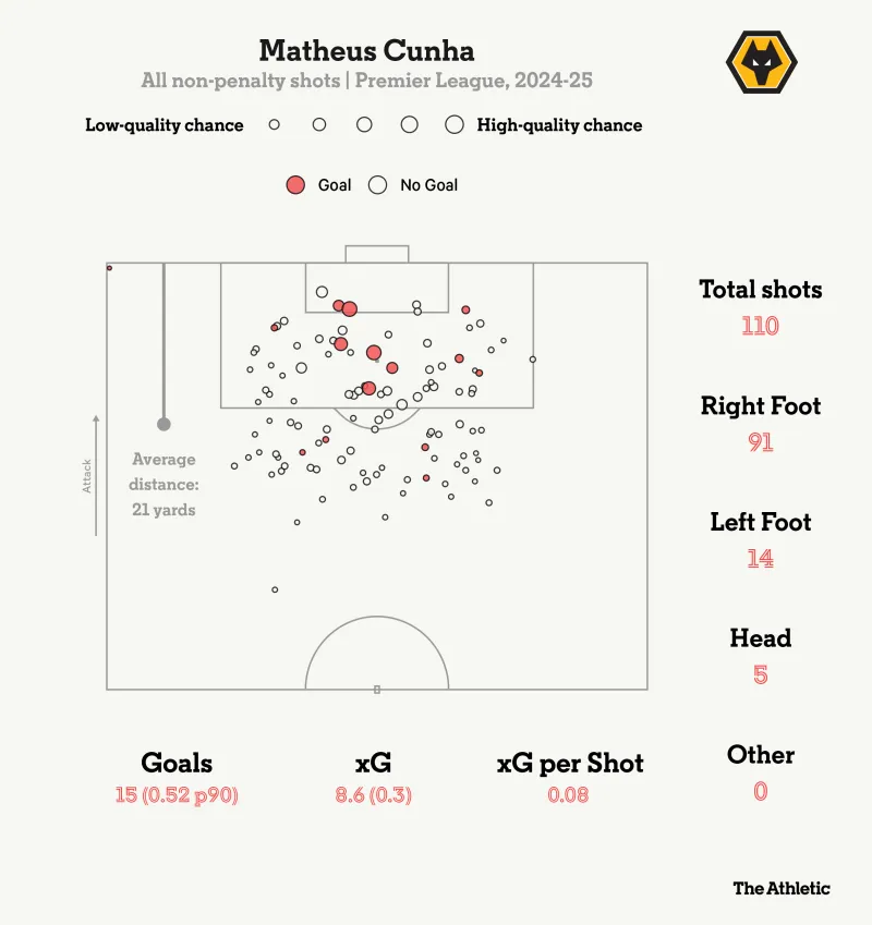 截至目前,庫(kù)尼亞的射門頻率與2024/25賽季持平,但運(yùn)氣卻未能再如約眷顧他。翻看他上賽季的射門熱區(qū)圖不難發(fā)現(xiàn),彼時(shí)他的射門方式極為豐富:既有多次遠(yuǎn)射嘗試,也頻頻在次六碼區(qū)完成起腳。