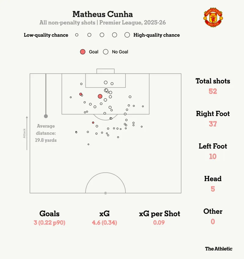 曼聯(lián)隊(duì)內(nèi)并非只有庫(kù)尼亞在2025/26賽季遭遇射門運(yùn)不濟(jì)的問(wèn)題。B費(fèi)本賽季至今已四次擊中門框,次數(shù)高居英超所有球員之首。不過(guò)本賽季阿莫林執(zhí)教曼聯(lián)出戰(zhàn)的19場(chǎng)英超聯(lián)賽,球隊(duì)共計(jì)打入 33球,比他上賽季執(zhí)教球隊(duì)的26場(chǎng)英超,進(jìn)球數(shù)還多了3粒。