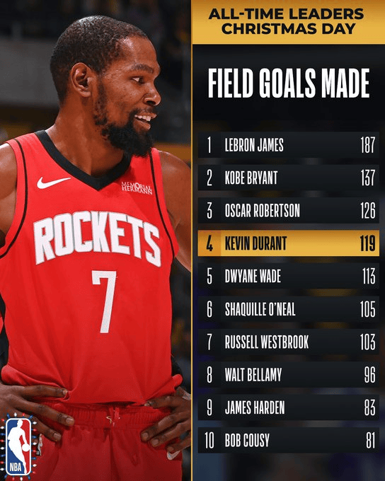 賽后,據(jù)NBA官方消息,杜蘭特在NBA圣誕大戰(zhàn)中已119次運(yùn)動(dòng)戰(zhàn)進(jìn)球,升至歷史第四位。