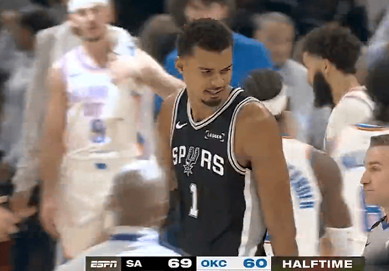 虎撲12月26日訊 NBA常規(guī)賽圣誕大戰(zhàn),馬刺客場對陣雷霆比賽正在進行中,場馬刺目前上半場結束馬刺以69-60領先雷霆。板半