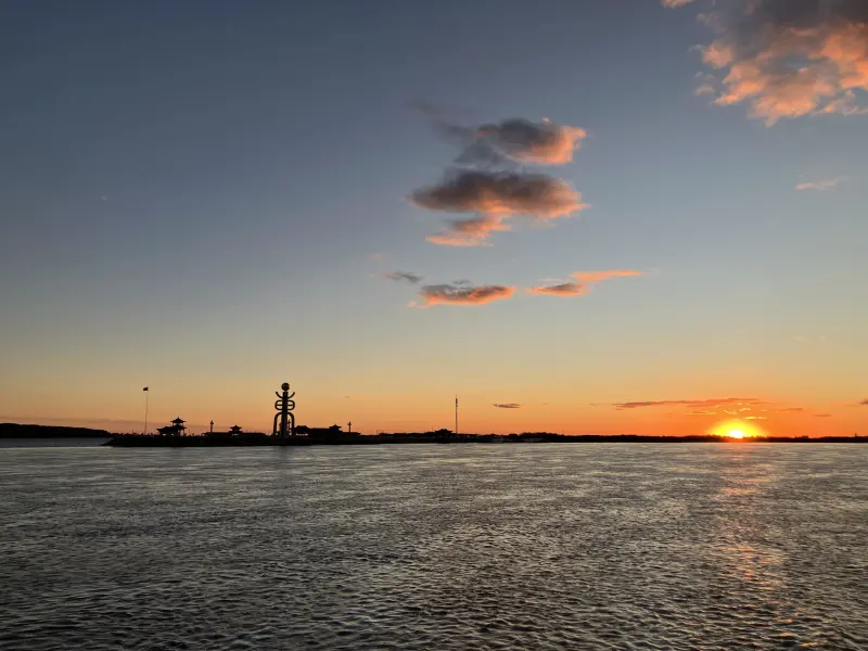 鶴崗出發(fā)半個(gè)小時(shí)到了蘿北,離開(kāi)黑河后重新回到黑龍江畔。三江平原和想象中的北大倉(cāng)并不一樣,田野會(huì)被樹(shù)木圍欄分隔開(kāi),不能一覽無(wú)余。同江是松花江匯入黑龍江的江口,沒(méi)有太多特別之處,修整一天直達(dá)撫遠(yuǎn)。在東極廣場(chǎng),我們看到了中國(guó)最早的日落,和最早的日出。