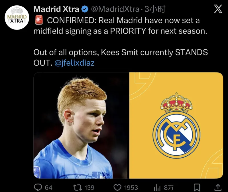皇馬跟隊jfd:皇家馬德里已將簽下一名中場球員列為下賽季的首要任務(wù)。在所有候選者中,基斯·斯密特目前是頭號人選。