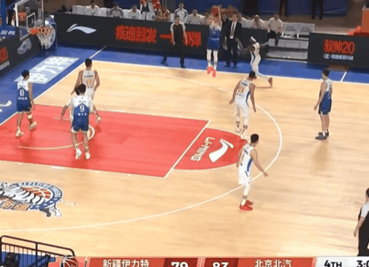 第四節(jié)比賽,新疆齊麟假動作騙過對手三分再中,僅剩剩3分鐘新疆追至分差僅剩1分。流言麟假