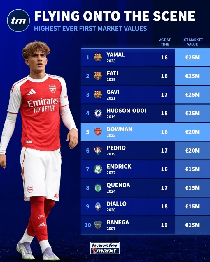 值得一提的是,在德轉(zhuǎn)所有球員初始身價估值中,道曼2000萬歐元排在歷史第五位。前四位分別是亞馬爾(16歲、2500萬)、法蒂(16歲、2500萬)、加維(17歲、2500萬)以及奧多伊(18歲、2500萬)。