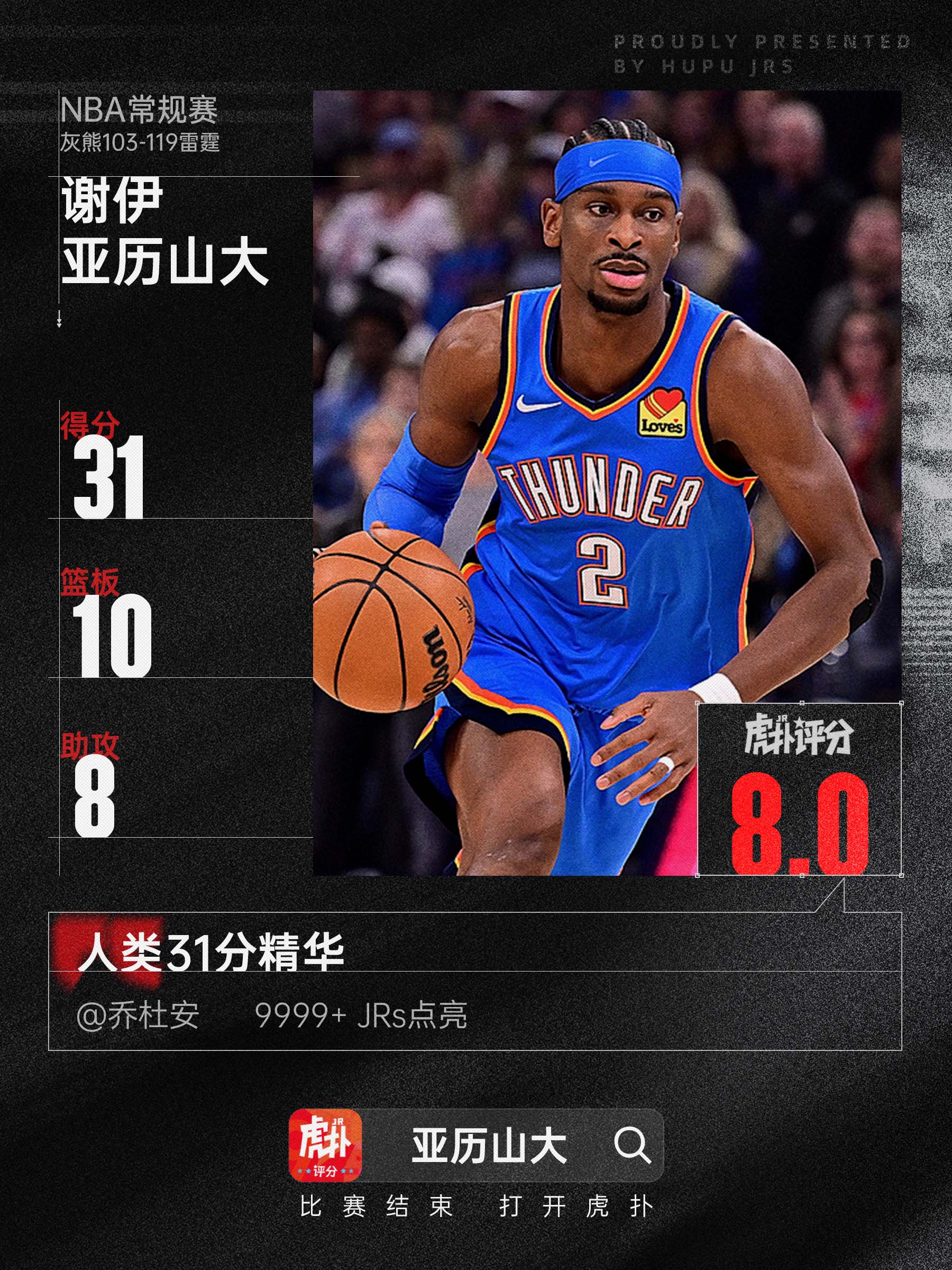 亞歷山大全場(chǎng)得到31分10籃板8助攻4搶斷1封蓋由虎撲籃球資訊 發(fā)表在籃球資訊 https://bbs.hupu.com/502