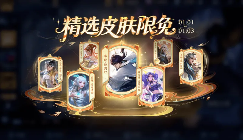 活動(dòng)時(shí)間1月1日-1月3日,三十五款皮膚免費(fèi)使用,包括狄仁杰-神器·狴犴令、云纓-鶴歸松棲等限定皮膚在內(nèi)。