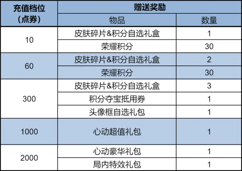 活動(dòng)時(shí)間1月1日-1月4日,每日充值到對(duì)應(yīng)檔位,可領(lǐng)取皮膚碎片、榮耀積分和回城特效禮包等獎(jiǎng)勵(lì)。