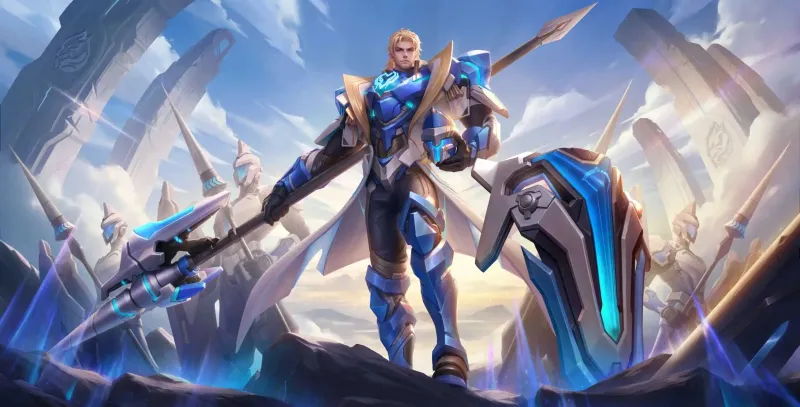 建模設(shè)計(jì)上,蒙恬金色長(zhǎng)發(fā)搭配藍(lán)白雙色流線型機(jī)甲,技能特效以寶藍(lán)色為主,融入了挑戰(zhàn)者杯的全息投影徽章。