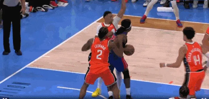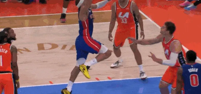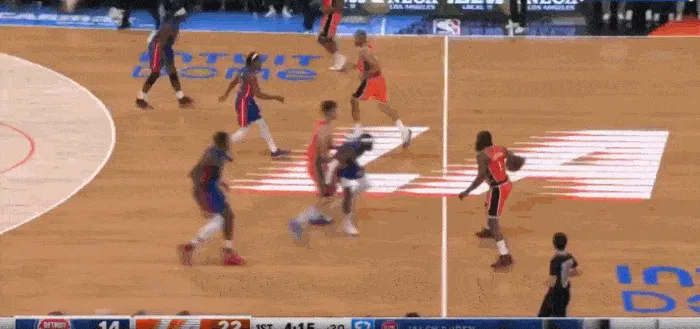 這個(gè)進(jìn)攻從洛佩斯擋拆拉出杜倫開始,活塞內(nèi)線就處于真空狀態(tài),而哈登的突破又吸引對(duì)方防守收縮,這就給外線的投手非常好的投射空間。