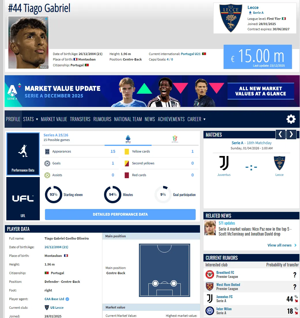 俱樂部體育總監(jiān)蒂亞戈-平托,注萊左腳中衛(wèi)這位意甲的切歲老炮,不僅開始關(guān)注薩索洛后衛(wèi)穆哈雷莫維奇,季場進(jìn)球還關(guān)注了萊切的意甲葡萄牙中后衛(wèi)蒂亞戈·加布里埃爾。