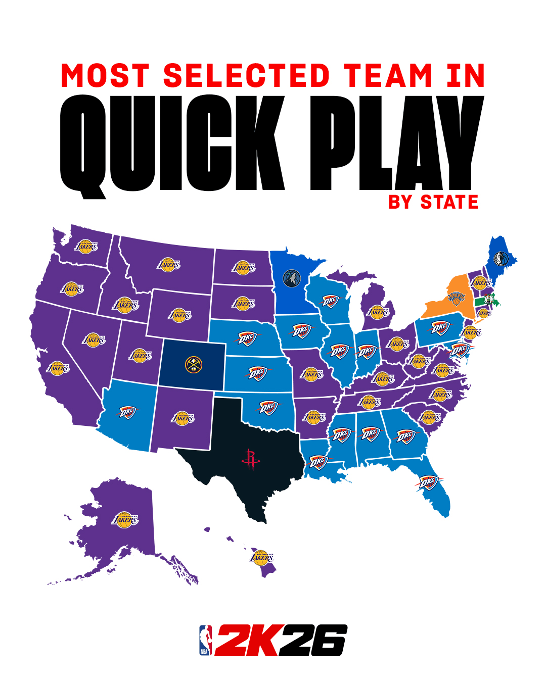 [流言板]NBA2K全美各州玩家快速游戲選擇最多球隊(duì):湖人、雷霆前二