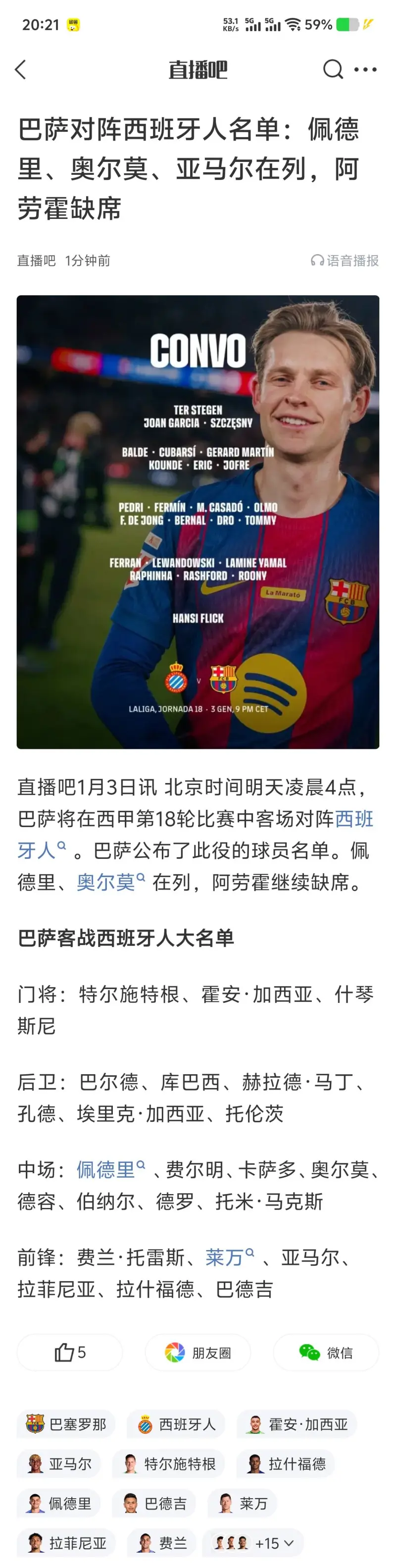 巴薩對陣西班牙人名單:佩德里、奧爾莫、亞馬爾在列,阿勞霍缺席