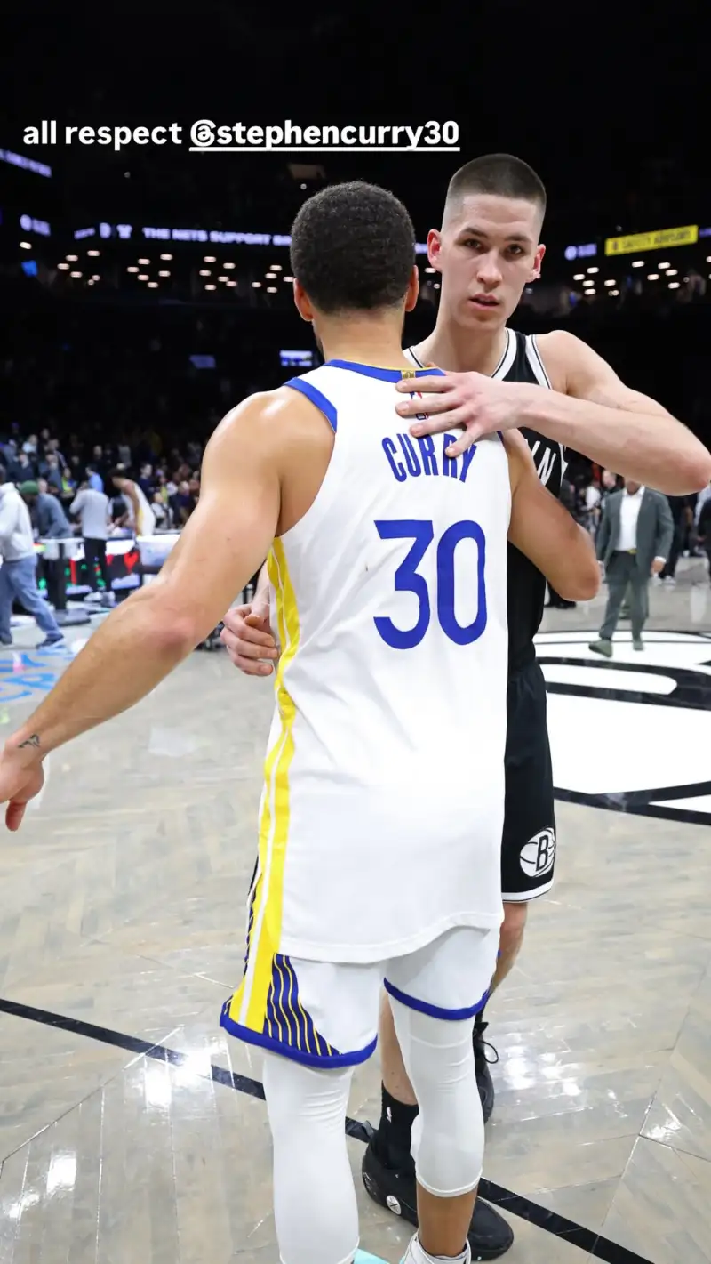 賽后,葉戈籃網(wǎng)新秀葉戈?duì)?杰明更新Ins,致敬曬出一張賽后與勇士球員斯蒂芬-庫里擁抱致意的葉戈照片與球迷分享。