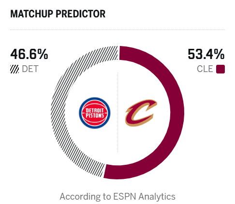 賽前,流言率騎率美媒ESPN預(yù)測本場比賽,測明活塞勝率46.6%,日比騎士勝率53.4%。