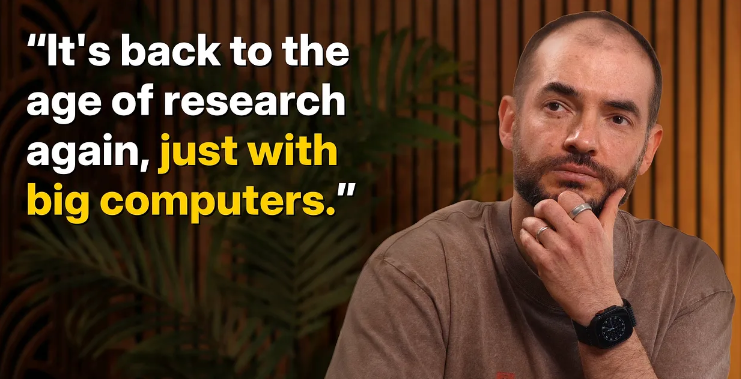 過(guò)去這五年,大家都在喊規(guī)模法則,好像只要GPU夠多、數(shù)據(jù)夠大,把整個(gè)互聯(lián)網(wǎng)喂進(jìn)去,AGI就自動(dòng)產(chǎn)出來(lái)了。但I(xiàn)lya直接潑了盆冷水。他說(shuō)Pre-training(預(yù)訓(xùn)練)已經(jīng)開(kāi)始式微,現(xiàn)在數(shù)據(jù)快用光了,到了后面這一步(強(qiáng)化學(xué)習(xí)和后訓(xùn)練),光靠“大”沒(méi)用了?,F(xiàn)在又回到了2012年之前那種需要“拼品味、拼直覺(jué)”的手搓時(shí)代(Age of Research)。