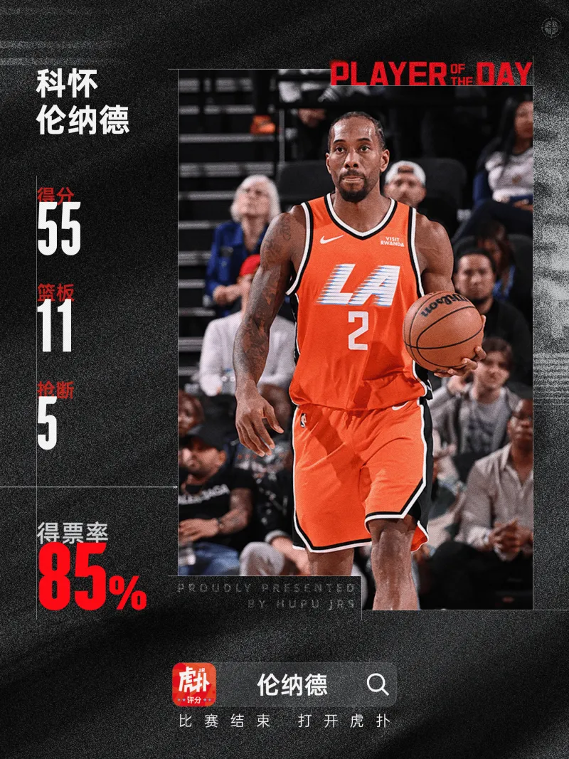 今日,快船球員科懷-倫納德以85%的攻防得票率當(dāng)選今日J(rèn)Rs評選最佳球員。
