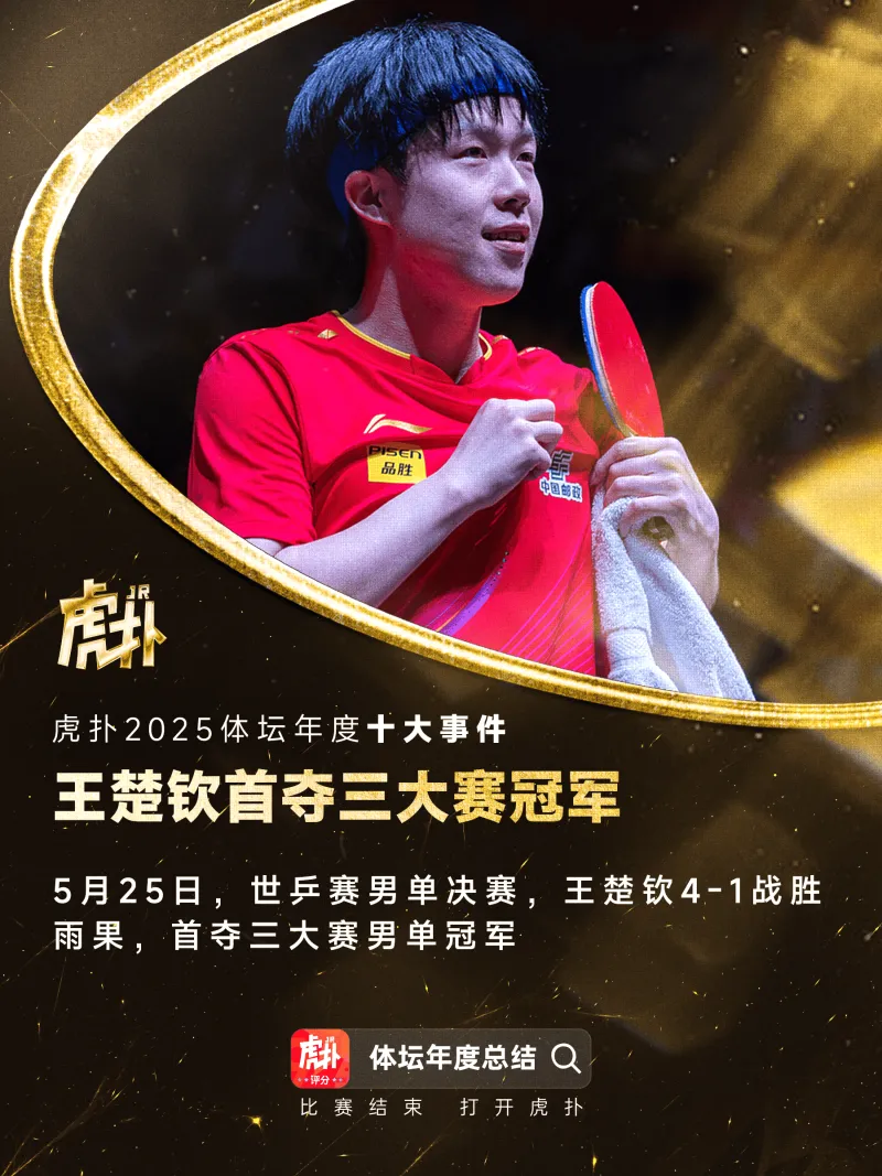 5月25日,世乒賽男單決賽中,王楚欽4-1戰(zhàn)勝雨果,首奪三大賽男單冠軍。