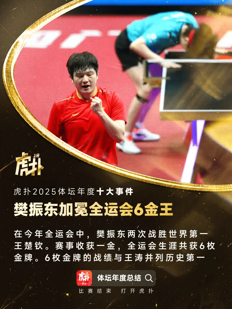 本屆全運(yùn)會,樊振東收獲1金1銀,至此,樊振東全運(yùn)會生涯共收獲6枚金牌。6枚金牌的戰(zhàn)績與王濤并列歷史第一。樊振東的6枚金牌包括2枚男單金牌,2枚男雙金牌,2枚男團(tuán)金牌。