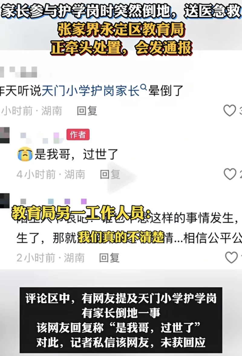 新聞?dòng)浾咦⒁獾剑?0日上午,一位網(wǎng)友在社交平臺(tái)發(fā)布視頻時(shí)寫道:“我哥在張家界天門小學(xué)護(hù)崗時(shí)死亡……我哥才45歲?!痹摼W(wǎng)友回復(fù)其他網(wǎng)友評(píng)論時(shí)透露,45歲的哥哥有兩個(gè)小孩,老大17歲,老二讀小學(xué)三年級(jí)。
