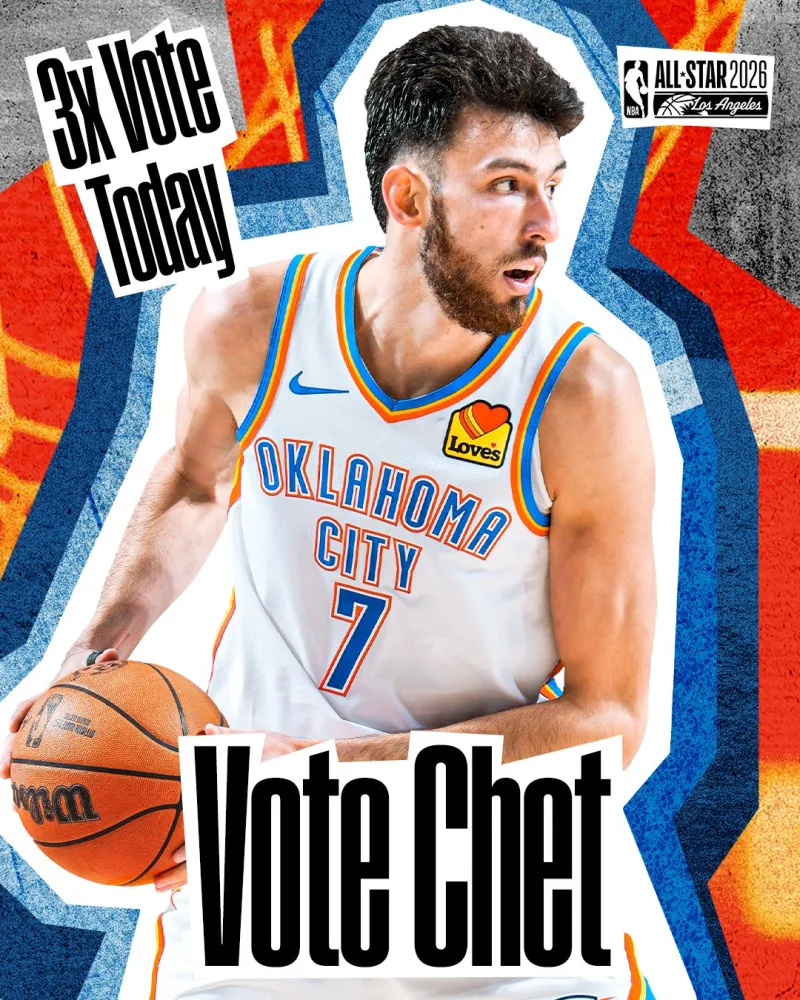 虎撲12月22日訊 今日,雷霆社媒發(fā)布切特-霍姆格倫的票雷全明星造勢(shì)海報(bào),并配文:
