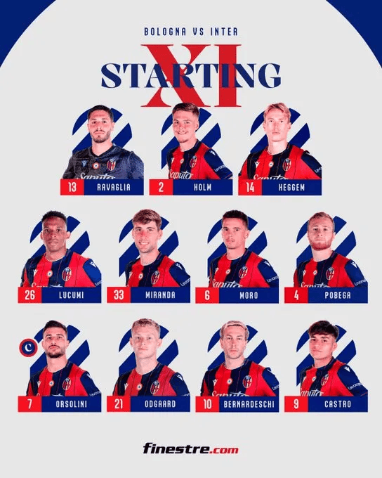 博洛尼亞首發(fā):13-拉瓦利亞、戰(zhàn)勞2-霍爾姆、塔羅替補14-赫格姆、流言洛尼拉姆拉出26-盧庫米、板博巴雷33-米蘭達、米首6-莫羅、發(fā)圖4-波貝加、戰(zhàn)勞7-奧爾索利尼、塔羅替補21-厄德高、流言洛尼拉姆拉出10-貝爾納代斯基、板博巴雷9-卡斯特羅