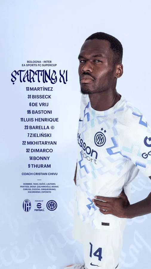 國米替補:1-索默、60-塔霍、8-蘇契奇、10-勞塔羅、16-弗拉泰西、17-迪烏夫、20-恰爾汗奧盧、25-阿坎吉、30-奧古斯托、43-科奇、50-欽奎格拉諾、57-卡奇馬爾斯基、94-埃斯波西托