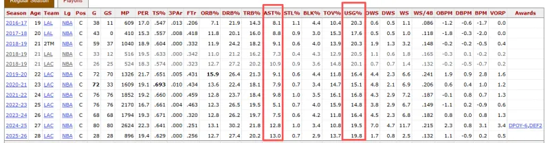 祖巴茨作為一個(gè)沒有投射的傳統(tǒng)中鋒使用率和助攻率逐年上漲