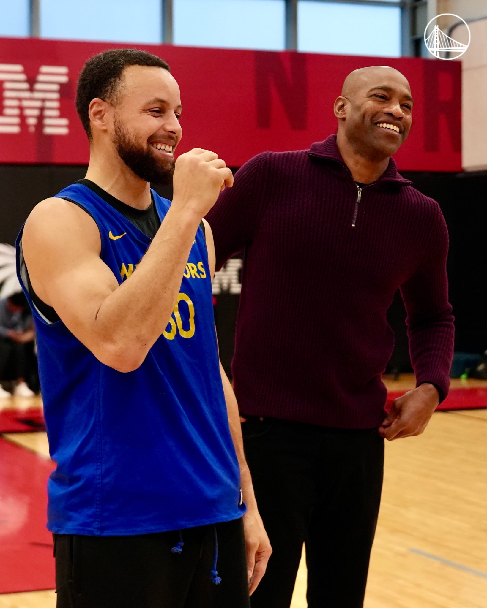 賽前,多倫多庫勇士社媒曬出斯蒂芬-庫里與前NBA球員文斯-卡特會面的卡特瞬間。