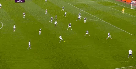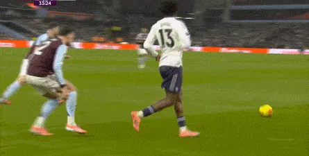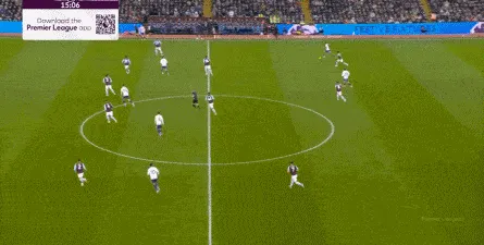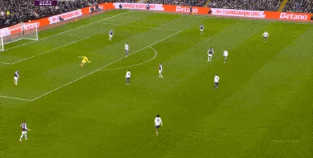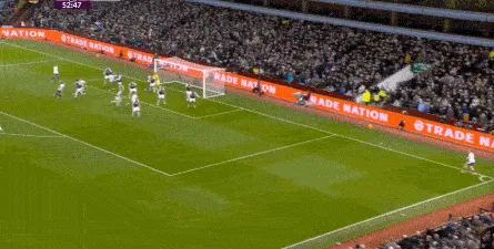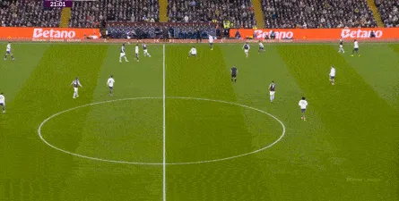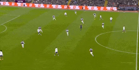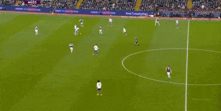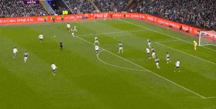比賽第33分鐘,維拉在后場(chǎng)輕松起腳,沃特金斯和隊(duì)友在海文和烏加特的身上打出并保住優(yōu)勢(shì),從而將球權(quán)轉(zhuǎn)給了邊路的羅杰斯,讓他有了和約羅一對(duì)一的機(jī)會(huì):
