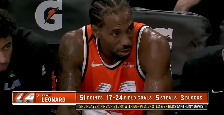 快船球員倫納德出戰(zhàn)32分鐘,分更罰球投籃24中17砍下51分8籃板1助攻??植?/p>