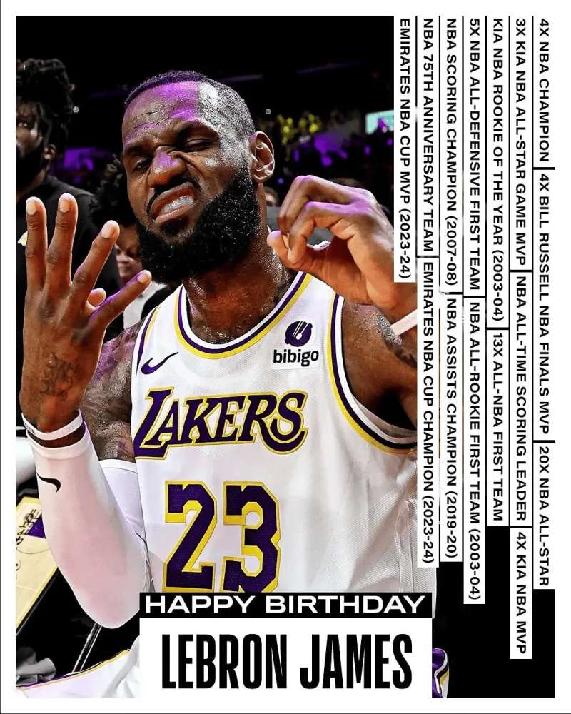 NBA官推列舉了詹姆斯的入歲生涯榮譽,祝福詹姆斯生日快樂:
