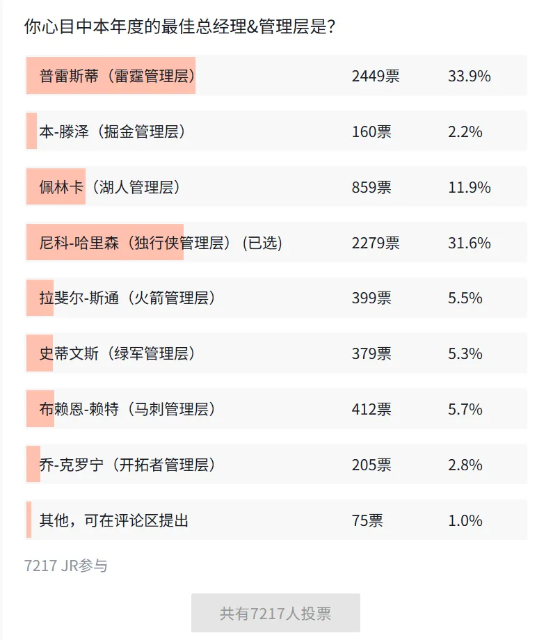 本次年度最佳總經(jīng)理&管理層的佳總經(jīng)理評選已經(jīng)結束,共有7217人投票,蒂當最終雷霆總經(jīng)理普雷斯蒂以33.9%的虎撲得票率險勝當選: