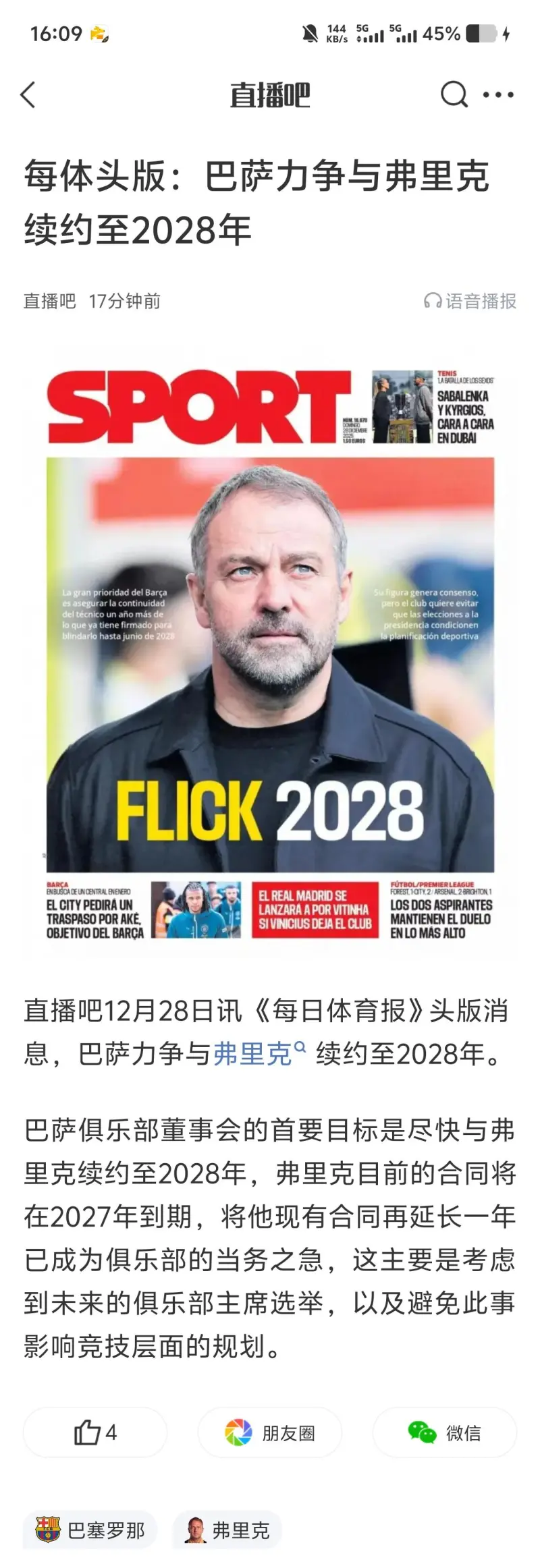 每體頭版:巴薩力爭與弗里克續(xù)約至2028年