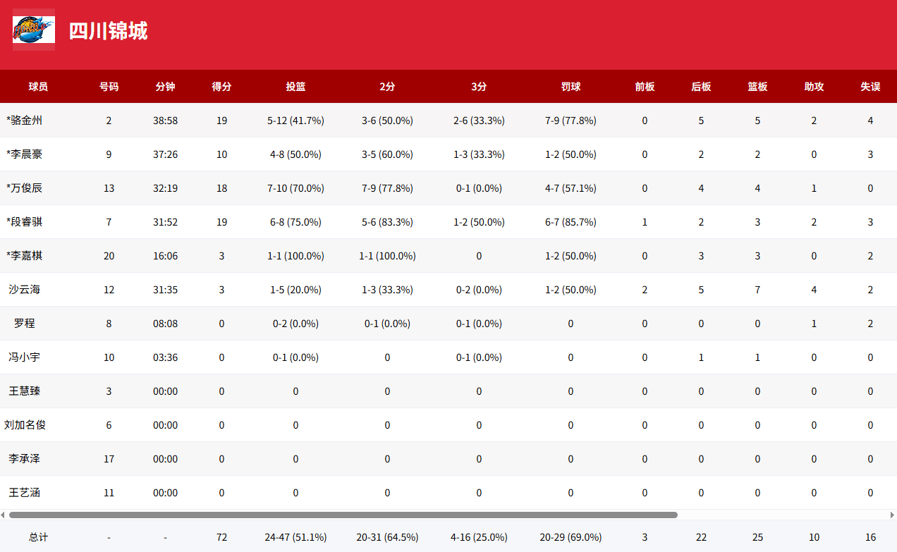 四川:段睿騏19分、分川駱金州19分、流言籃萬俊辰18分。全國