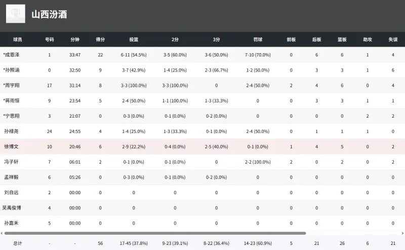 山西:成恩澤22分、賽段孫照涵9分、睿騏周宇翔8分。分川
