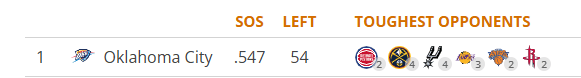 而根據(jù)Tankathon的數(shù)據(jù),本場比賽過后,雷霆剩余比賽的賽程強(qiáng)度將為全聯(lián)盟最高——對手的平均勝率將達(dá)到54.7%。