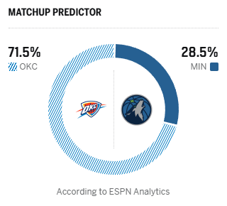 賽前,日比美媒ESPN預測本場比賽,賽雷勝率雷霆勝率71.5%,霆勝森林狼勝率28.5%。