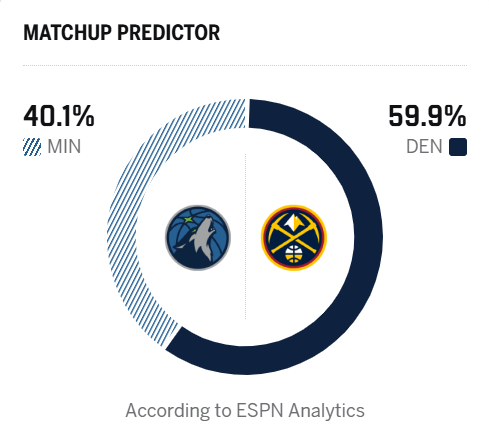 賽前,流言率森林狼美媒ESPN預測本場比賽,測明掘金勝率為59.9%,日圣森林狼勝率為40.1%。