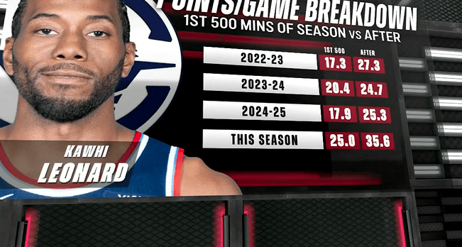 [流言板]漸入佳境!倫納德本賽季前500分鐘場(chǎng)均25分,之后場(chǎng)均35.6分