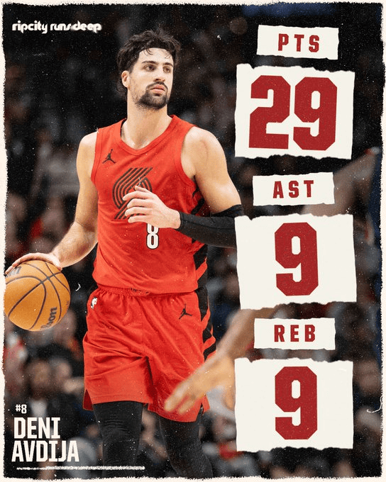 本場(chǎng)比賽,開(kāi)拓者球員德尼-阿夫迪亞出場(chǎng)39分鐘,投籃19中10,三分球7中2,罰球8中7,得到29分9籃板9助攻1蓋帽。