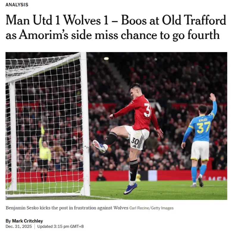 球隊的表現(xiàn)固然情有可原:阿莫林麾下大批核心球員缺陣,其中還包括三周前4-1大勝狼隊一役的全部三位進球功臣,這一點在一定程度上值得考量。