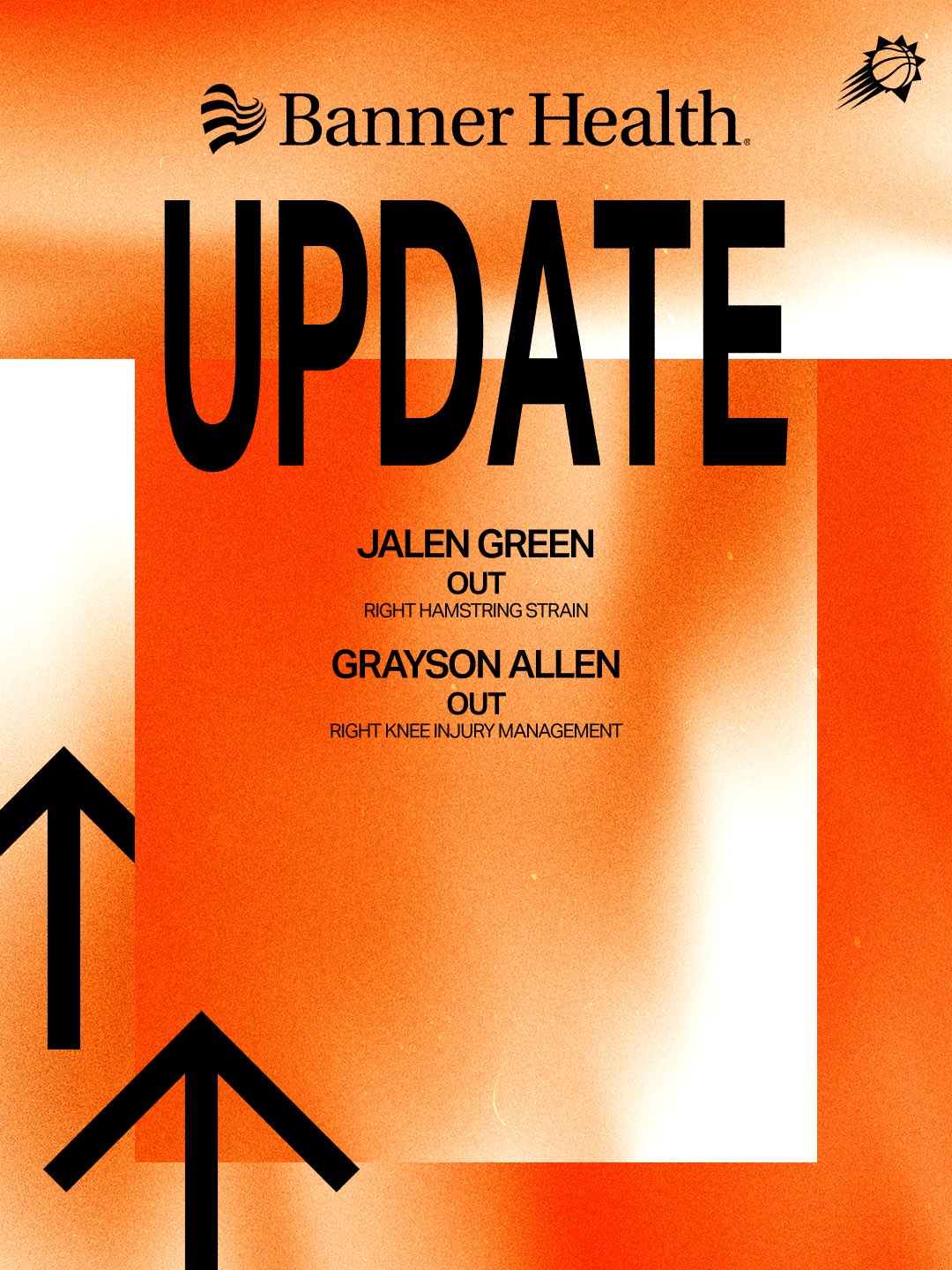 賽前,告杰太陽(yáng)社媒更新球員傷情報(bào)告:杰倫-格林由于腿筋傷勢(shì)無法出戰(zhàn)、流言倫格雷森-阿倫由于膝蓋傷勢(shì)無法出戰(zhàn)。板太布傷