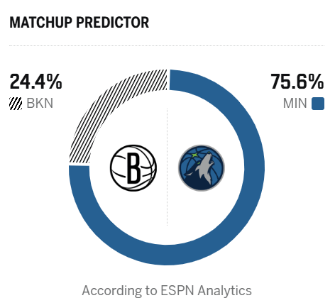 [流言板]ESPN預(yù)測明日比賽:森林狼勝率75.6%,籃網(wǎng)勝率24.4%