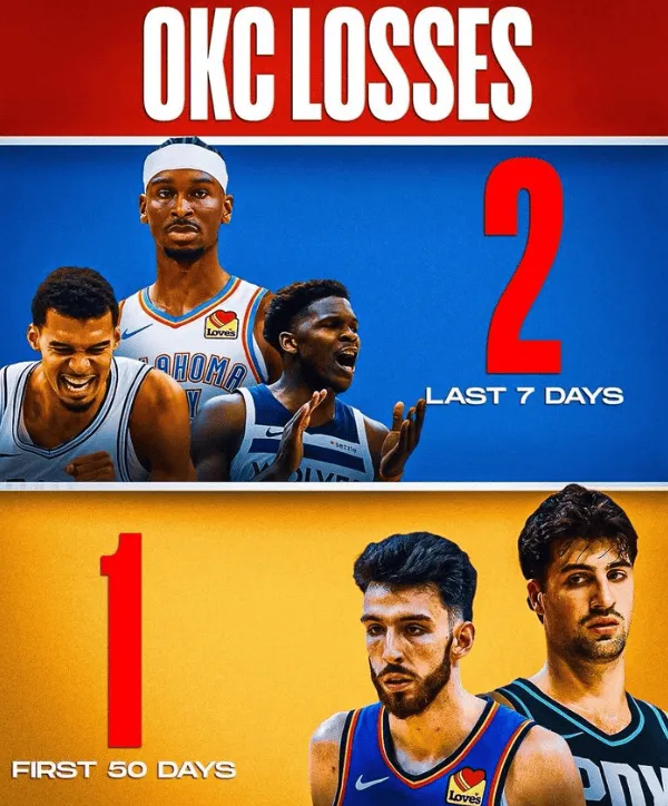 虎撲12月20日訊 美媒ClutchPoints發(fā)文提到雷霆在過(guò)去的一周輸了兩場(chǎng)比賽,而在這之前雷霆用了50天才輸?shù)舻谝粓?chǎng)比賽。