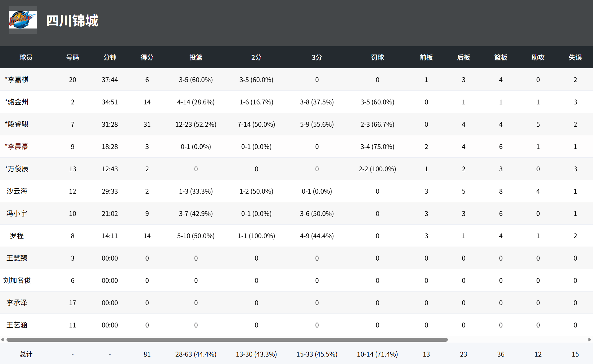 四川:段睿騏31分、賽段駱金州14分、睿騏羅程14分。分川