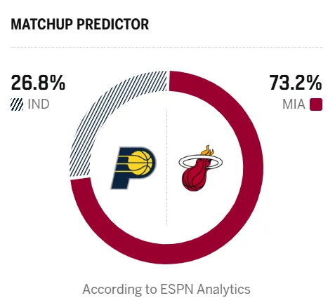 賽前,日比美媒ESPN預(yù)測(cè)本場(chǎng)比賽,賽熱勝率熱火勝率73.2%,火勝步行者勝率26.8%。