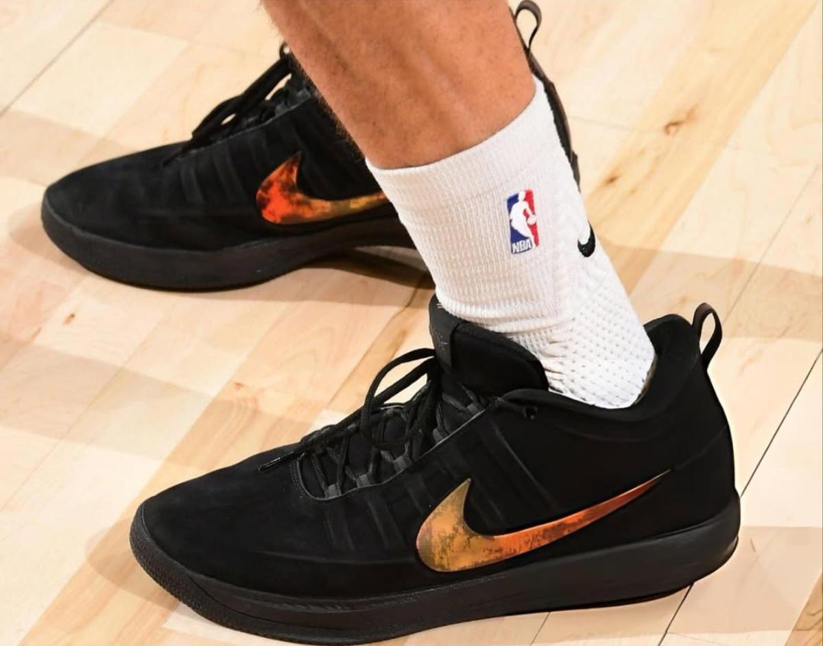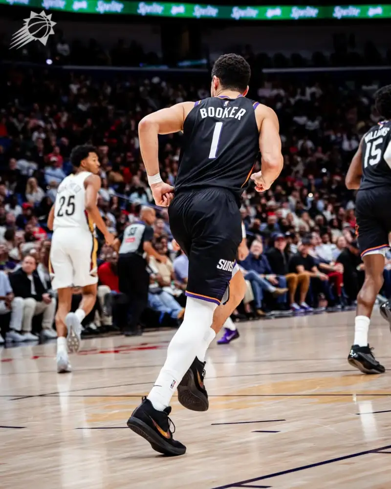 比賽中,克穿布克上腳黑橙色Nike BOOK2 PE。著黑