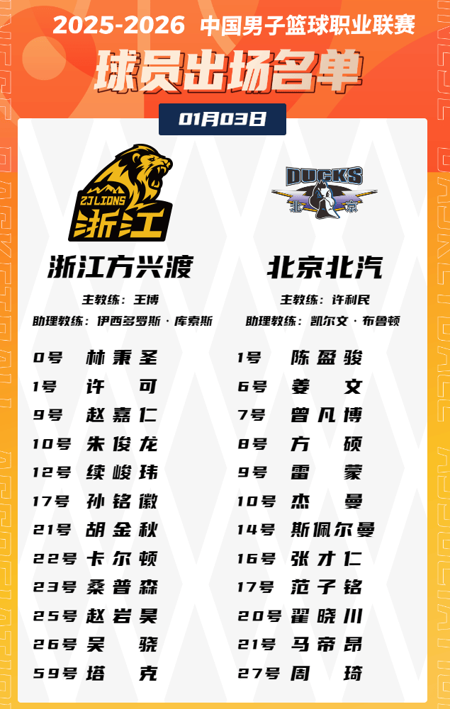 北京方面:方碩、晚廣陳盈駿出戰(zhàn),京大駿胡金秋趙睿缺席。名單